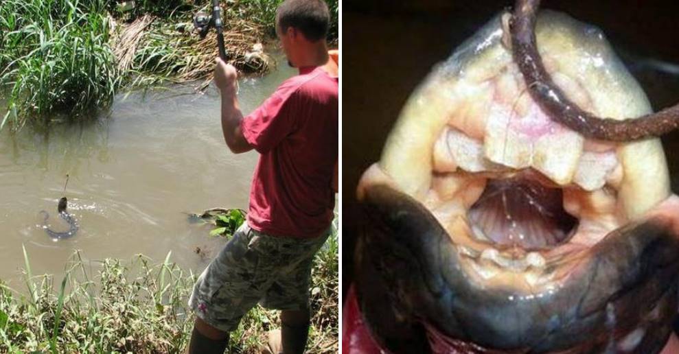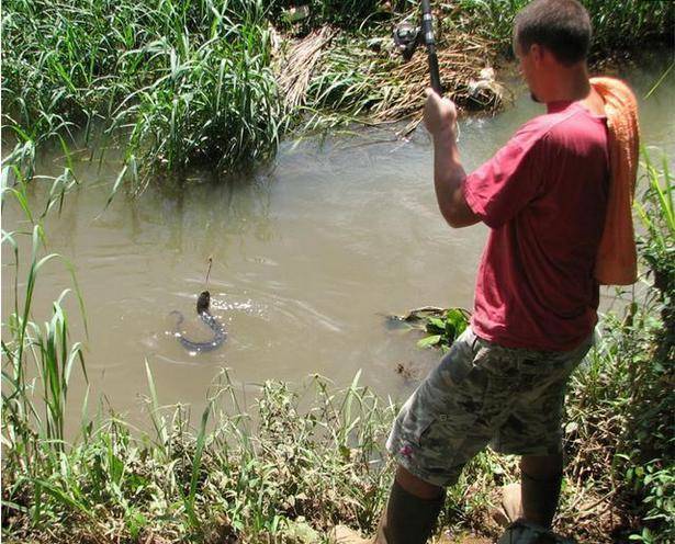 一男子在一處水洼處釣魚時無意間釣得了一條大魚,男子十分興奮,趕緊收桿拿回家。起初,男子看到這條魚時以為自己釣到的是一條大鰻魚,所以男子十分興奮。的確,從正面來看,這條魚與正常的鰻魚長得確實很相像。