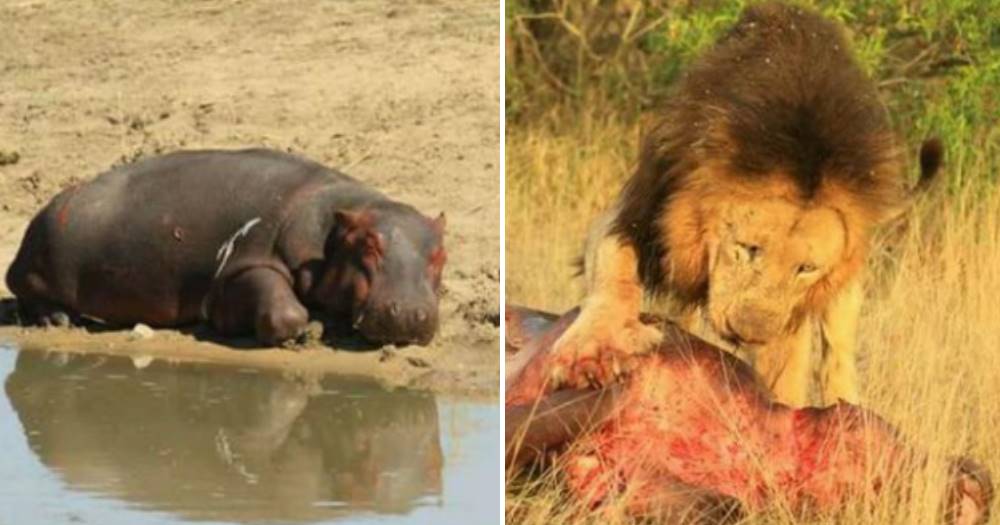 雄獅終于把小河馬拽到了一個安全的地方,這才開始休息了一會,準備開吃。小河馬的肚皮上已經被雄獅咬出了好幾個傷口,雄獅還回頭看了一眼,這才開始低頭吃肉。