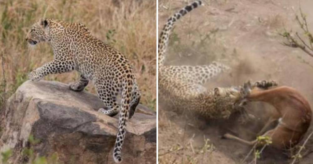 一只花豹現在無事趴在石頭上正在懶洋洋的曬太陽,看起來愜意極了正在休息的花豹突然眼神聚焦起來,看來是有什麼發現啊,原來花豹是看到了一只小野兔,這對于花豹來說簡直就是天上掉餡餅的美事花豹不管三七二十一立刻沖著小野兔就飛撲上去了!
