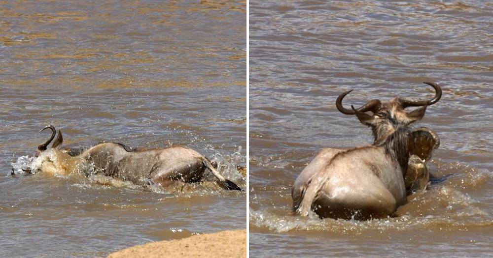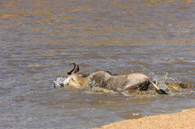 一只角馬正準備過河,可是剛走了沒幾步,突然在水中開始拼命掙扎,四處撲騰。人們一開始也不知道發生了什麼,但是直到角馬側身后才發現,就在角馬旁邊有一只鱷魚正張著大嘴攻擊角馬。鱷魚一開始隱藏在水里,角馬沒有發現,直到角馬進入水里,才從水底發動攻擊。